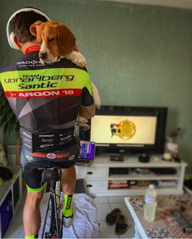 Avant le confinement, j’étais à mon appartement dans la région Vannetaise pour les études, car je suis en licence information-communication. C’était le début de saison pour tous les coureurs, donc je participais aux classiques belges avec mon équipe Arkéa Pro Cycling Team. Maintenant, je suis donc chez mes parents. J’étudie mes cours à distance et pour l’entrainement je fais de l’home-trainer via l’application Zwift.